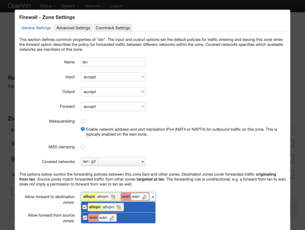 Необходимо перейти в меню Network → Firewall и нажать кнопку Edit напротив зоны lan