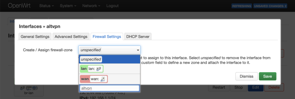 Необходимо создать новую зону в настройках firewall (Firewall Settings) для последующего назначения правил перенаправления трафика.