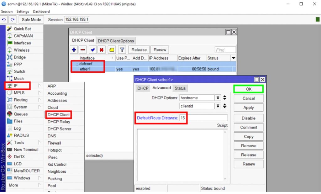 Нажимаем в главном меню IP -> DCHP Client. Скорее всего там будет единственная запись defconfс интерфейсом ether1 или sfp1, или какой-либо vpn-интерфейс (зависит от типа подключения у вашего провайдера). Если он один, два раза на него щелкаем, открываем его настройки, в строке «Default Route Distance» вводим любое значение больше 10. Например, 15. Если интерфейсов в DCHP-клиенте больше одного, то нужно разобраться, какие из них за что отвечают и грамотно расставить приоритет маршрутов.