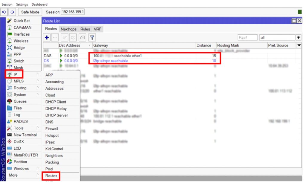 Открываем IP -> Routes. Смотрим на поле «Distance». Если вы ничего ранее не перенастраивали, у вас будет несколько строк со значением «0», одна строка с именем «ваше_название_vpn_reachable» с дистанцией 10 и одна строка с IP-адресом вашего провайдера и WAN-интерфейсом с дистанцией 15. Так и должно быть.